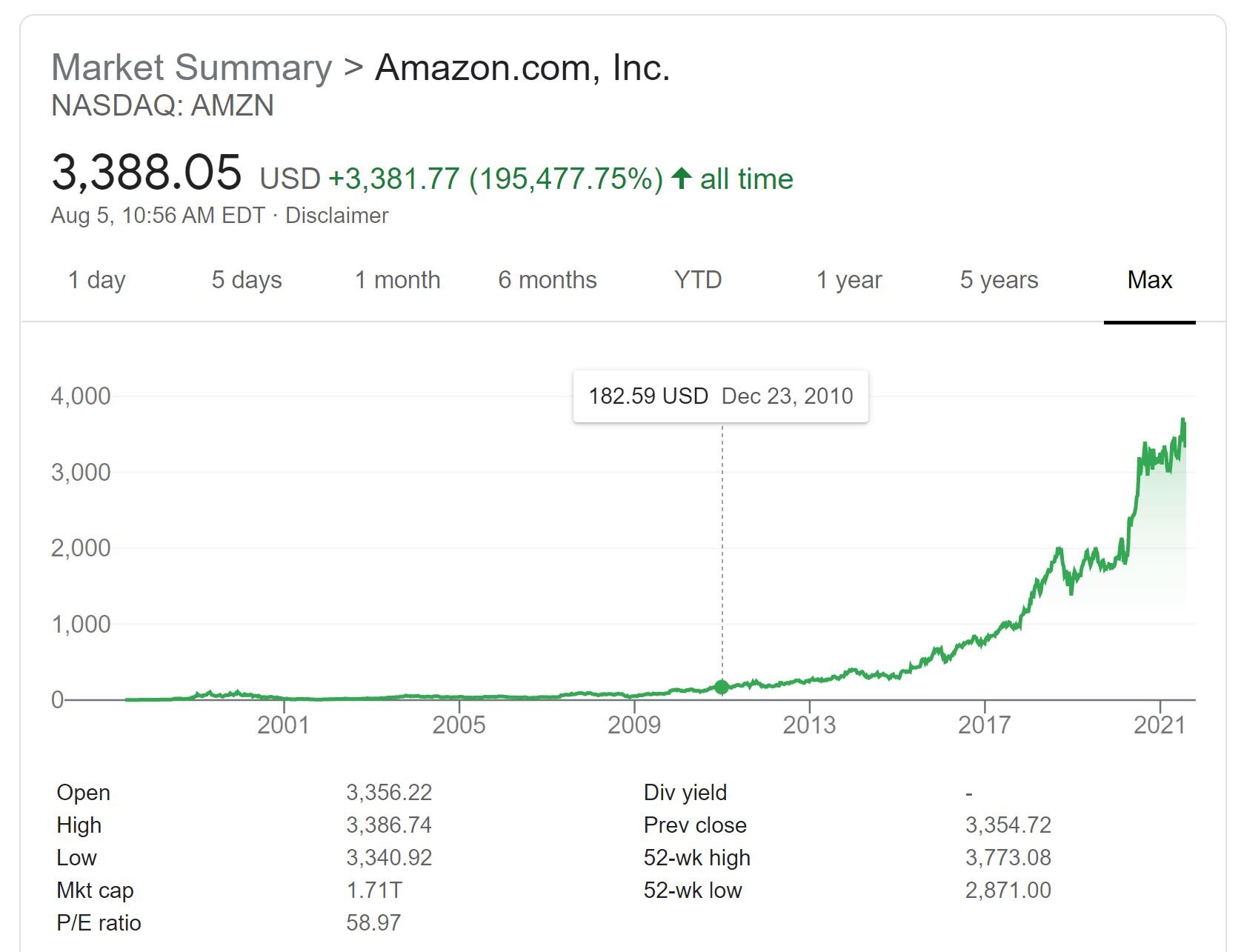 亚马逊的股价从 2011 年的 180 美元涨到了今天的3,380.01美元,在过去 10 年里巨大地增长了(超过 1000%!)。