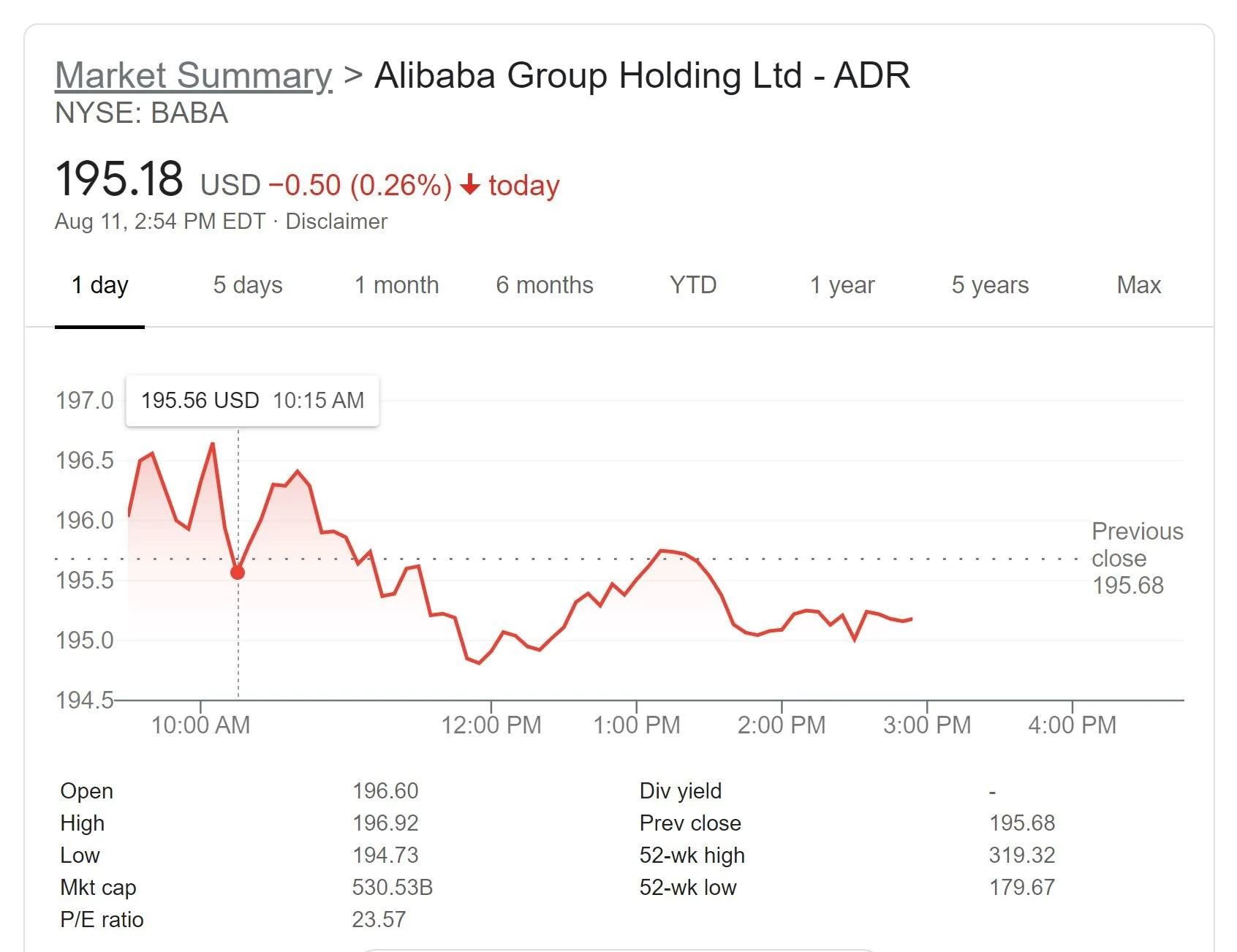 目前阿里巴巴的股价(股票代号 BABA)站在194.89美元。 市值是529.75十亿美元。