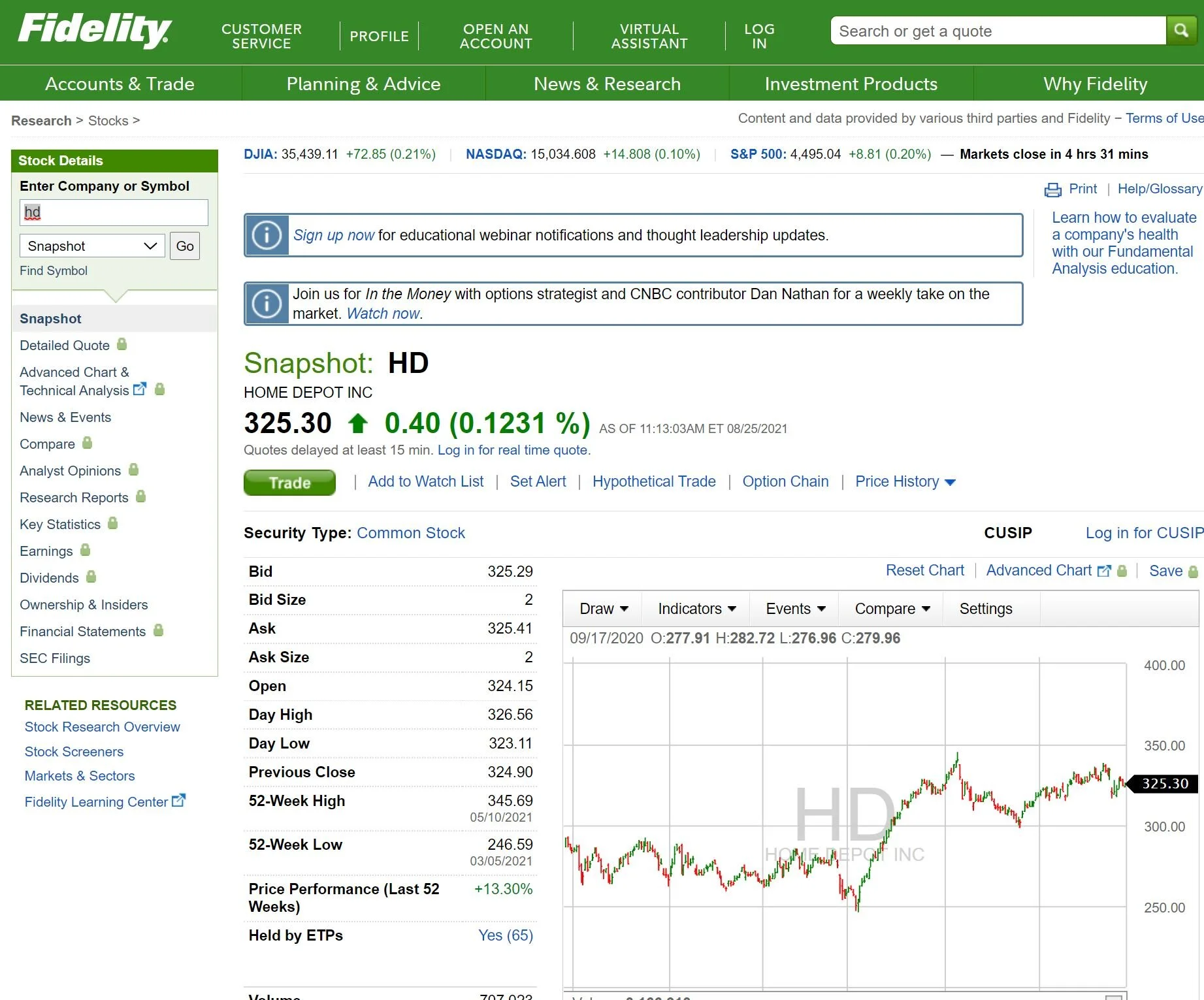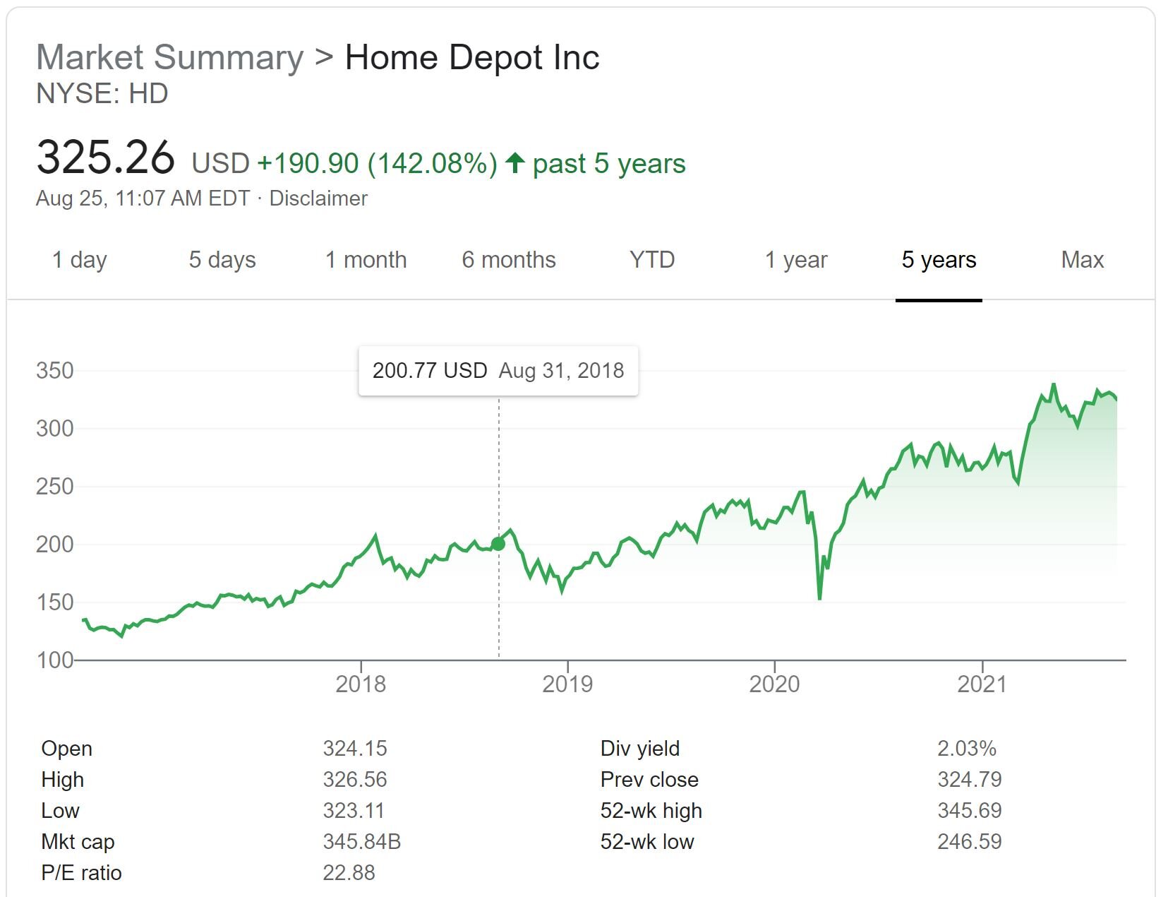 目前家得宝的股价(股票代号 HD)站在325.26美元。 市值是345.84十亿美元。