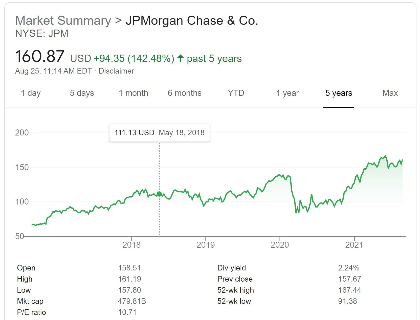 目前摩根大通的股价(股票代号 JPM)站在160.87美元。 市值是479.81十亿美元。
