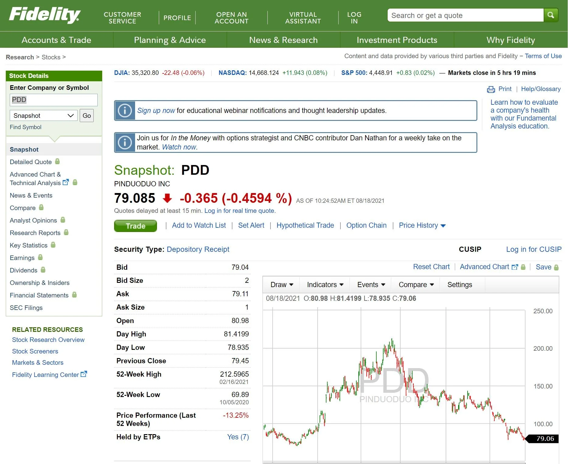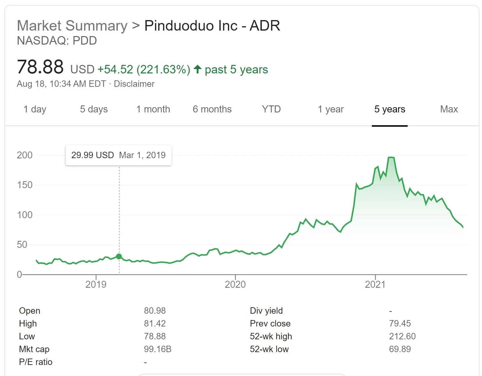 目前拼多多的股价(股票代号 PDD)站在78.88美元。 市值是99.16十亿美元。