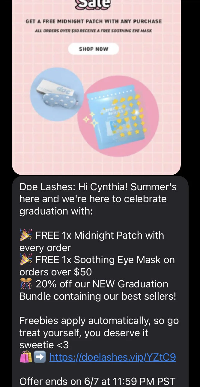 This is an example of good text message marketing that appeals to me. It is effective because it emphasizes a time constraint (by 6/7), has an eye-catching image (pink and blue), and convinces the buyer to click on the link by promoting free items (midnight patch and soothing eye match).
