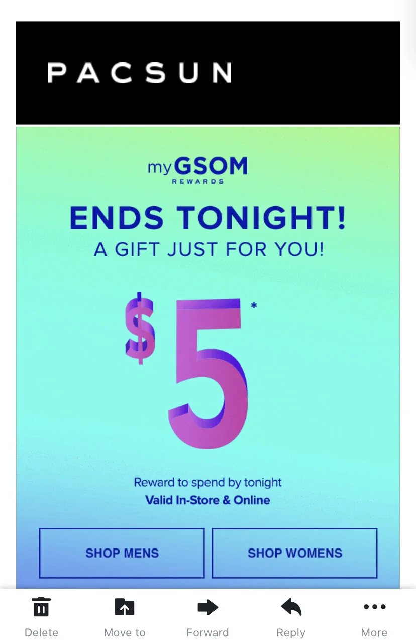 This is an example of good email marketing that appeals to me. It is effective because it emphasizes a time constraint (spend by tonight), has an eye-catching image (blue and purple), and convinces the buyer to click on the link by promoting something free ($5).