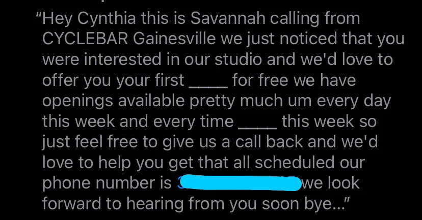 This is an example of good phone marketing that appeals to me. It is effective because it promotes something free (a Cyclebar ride).