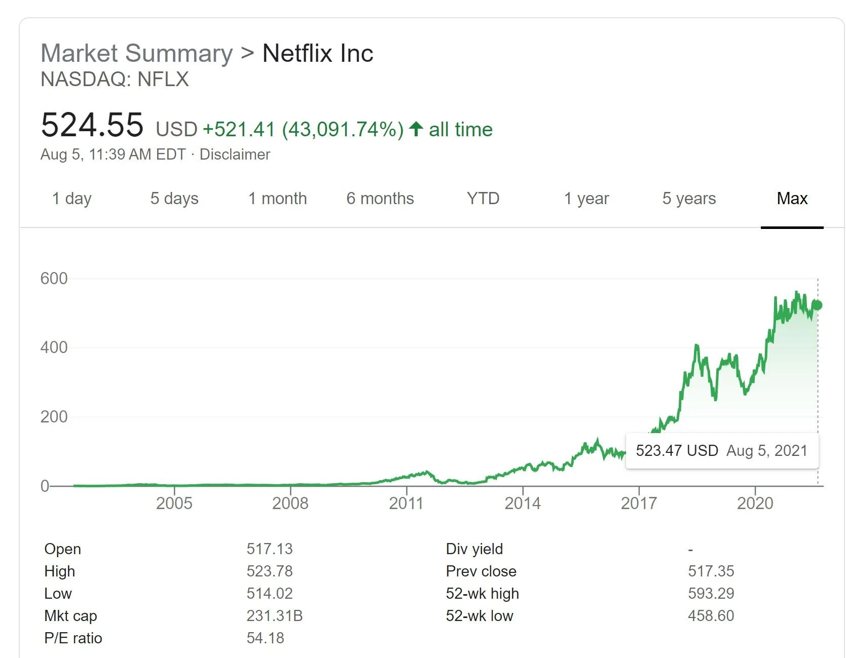 The current stock price for Netflix stock (Ticker NFLX) is $524.55. Market Cap is $231.31B.