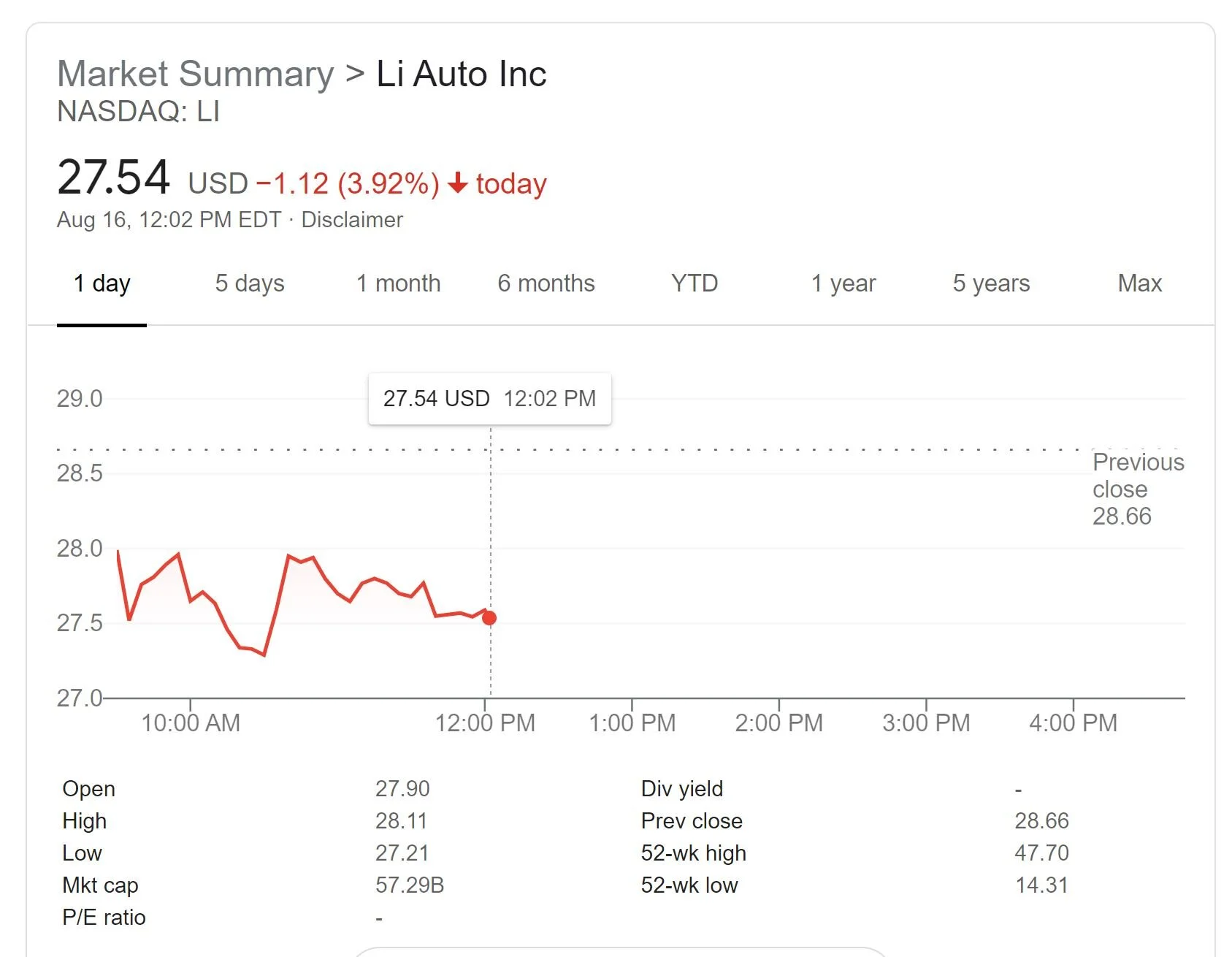 The current stock price for Li Auto Inc. stock (Ticker LI) is $27.51. Market Cap is