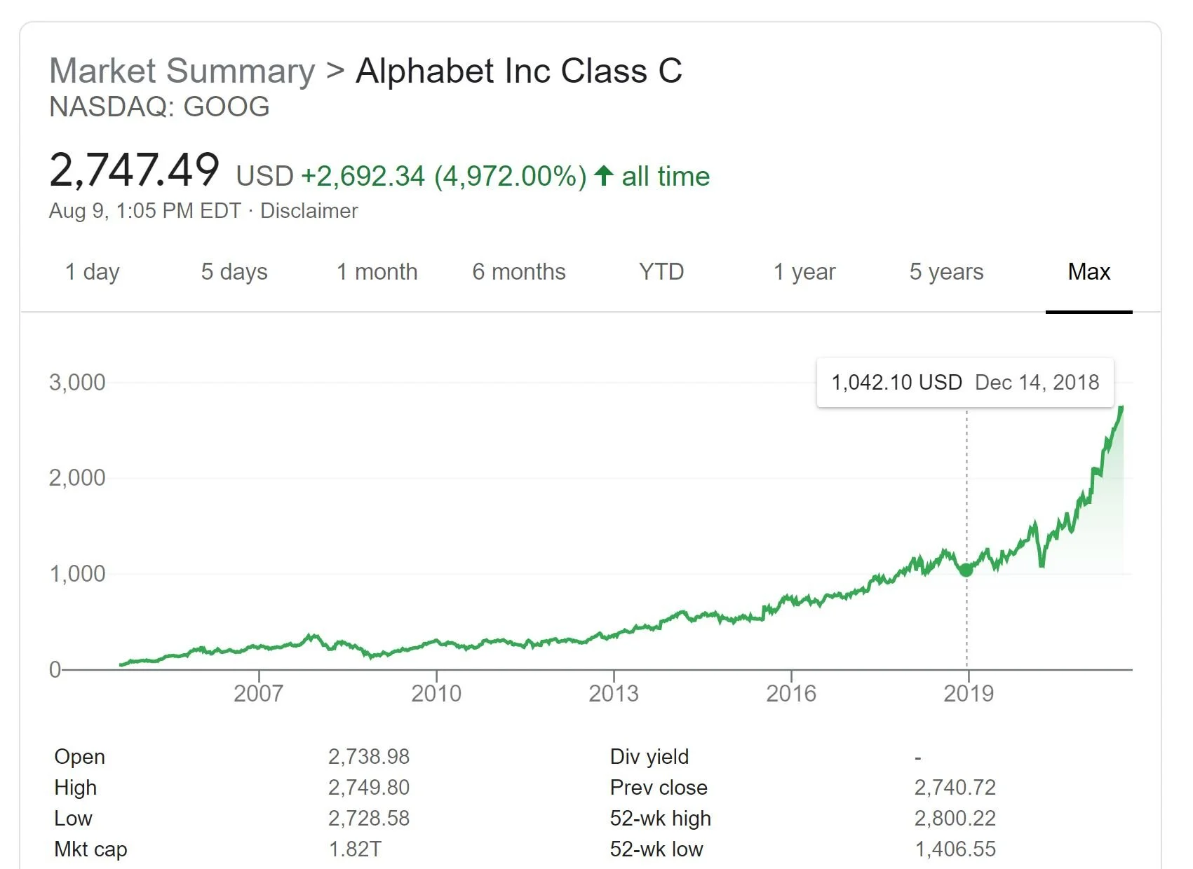 The current stock price for Alphabet stock (Ticker GOOG) is $2,746.49. Market Cap is