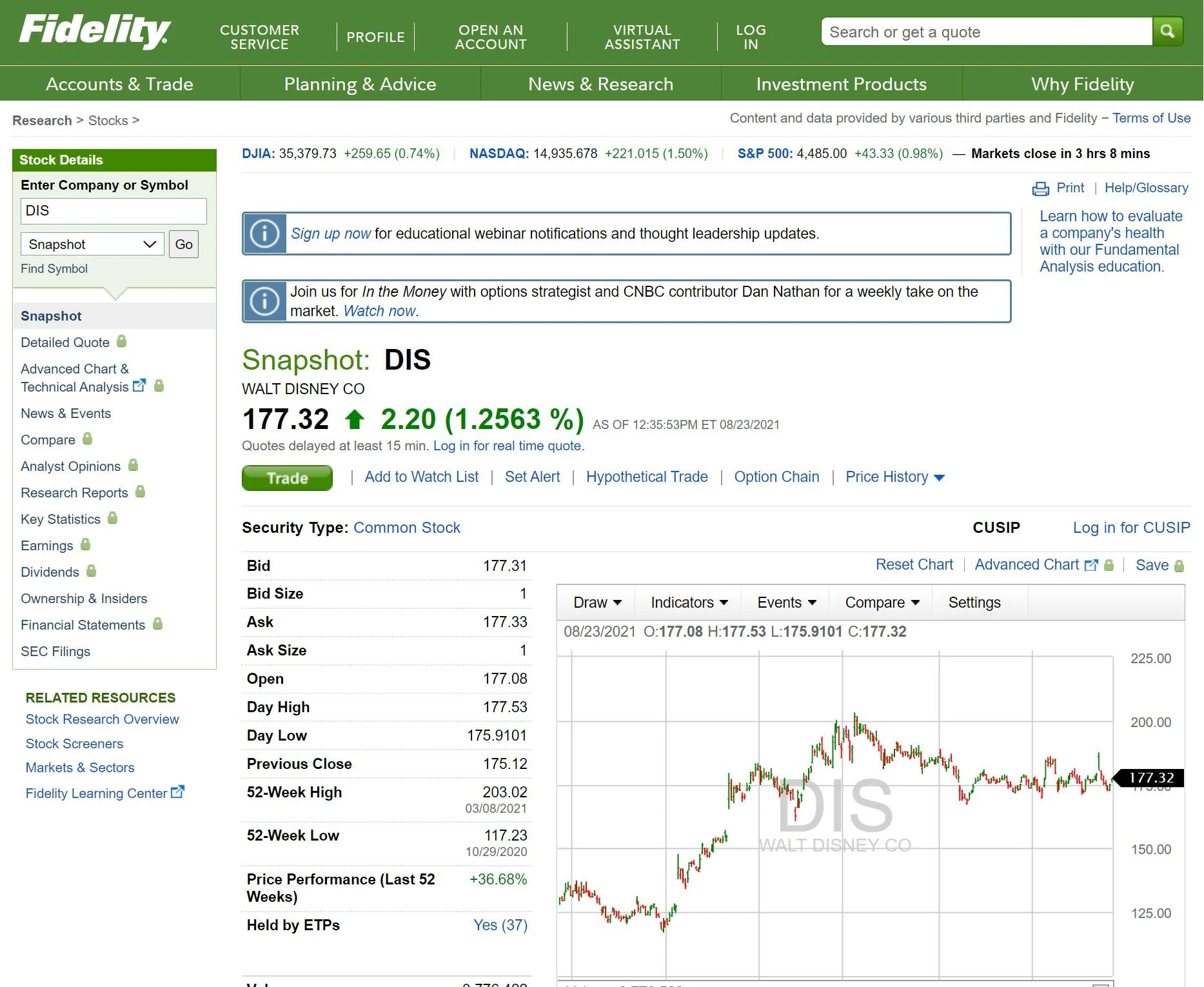 The current stock price for Disney Inc. stock (Ticker DIS) is $177.37. Market Cap is $322.3B.
