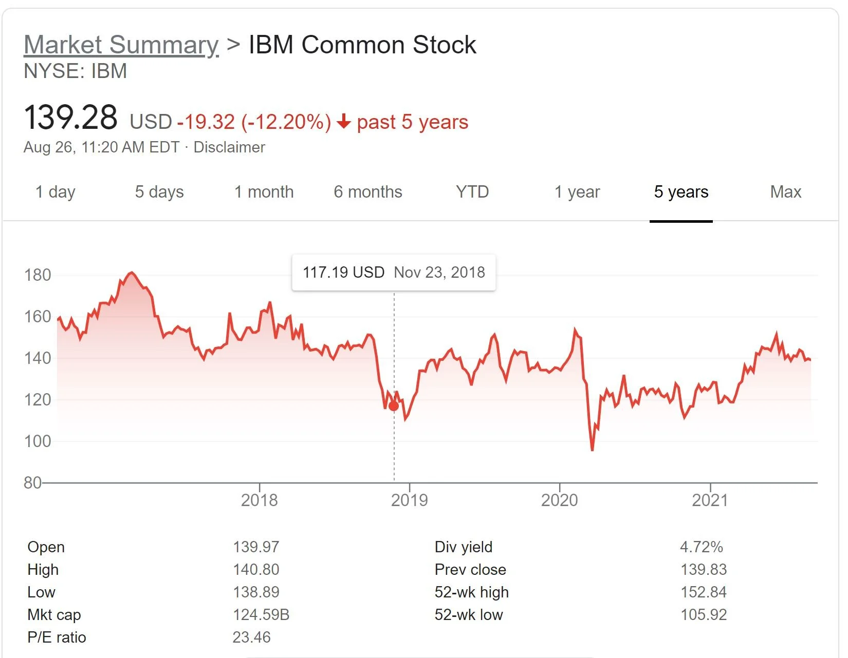 The current stock price for IBM stock (Ticker IBM) is $139.28. Market Cap is $124.59B.