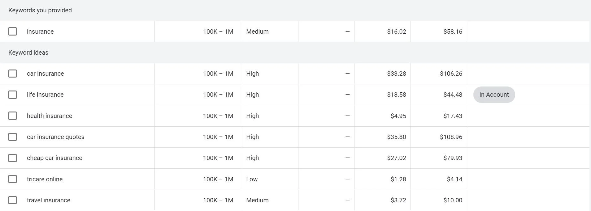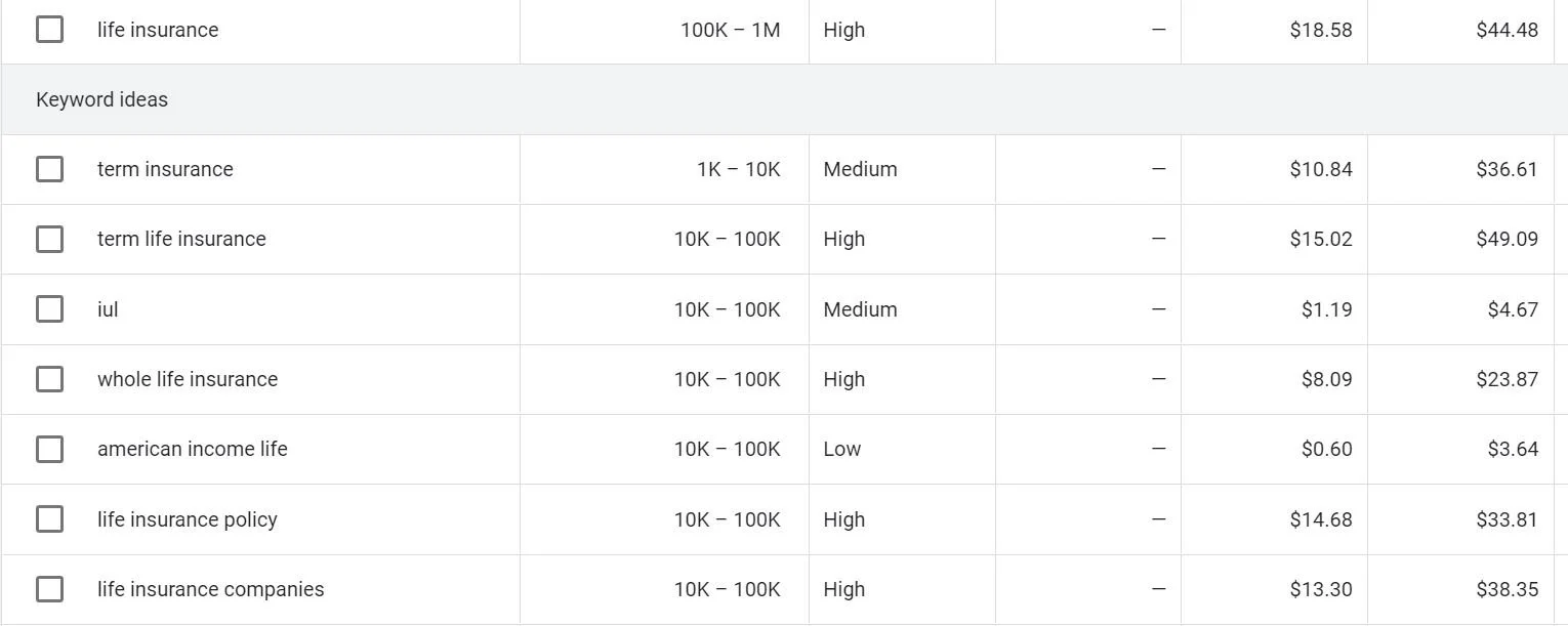 In addition to selecting the keywords for your ads it is also important to include negative keywords. If you look back at our first keyword search you can see that in addition to “life insurance” we also got searches for “car insurance”, “health insurance”, etc. In order to prevent the case that someone searching for a type of insurance we don’t provide will see our ads we need to add these terms to the “negative keywords”.