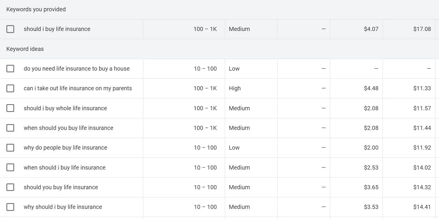 These keywords are already more relevant and affordable. If you use and even more narrow “long tail keyword” our such as : “should i buy life insurance” results are even better: