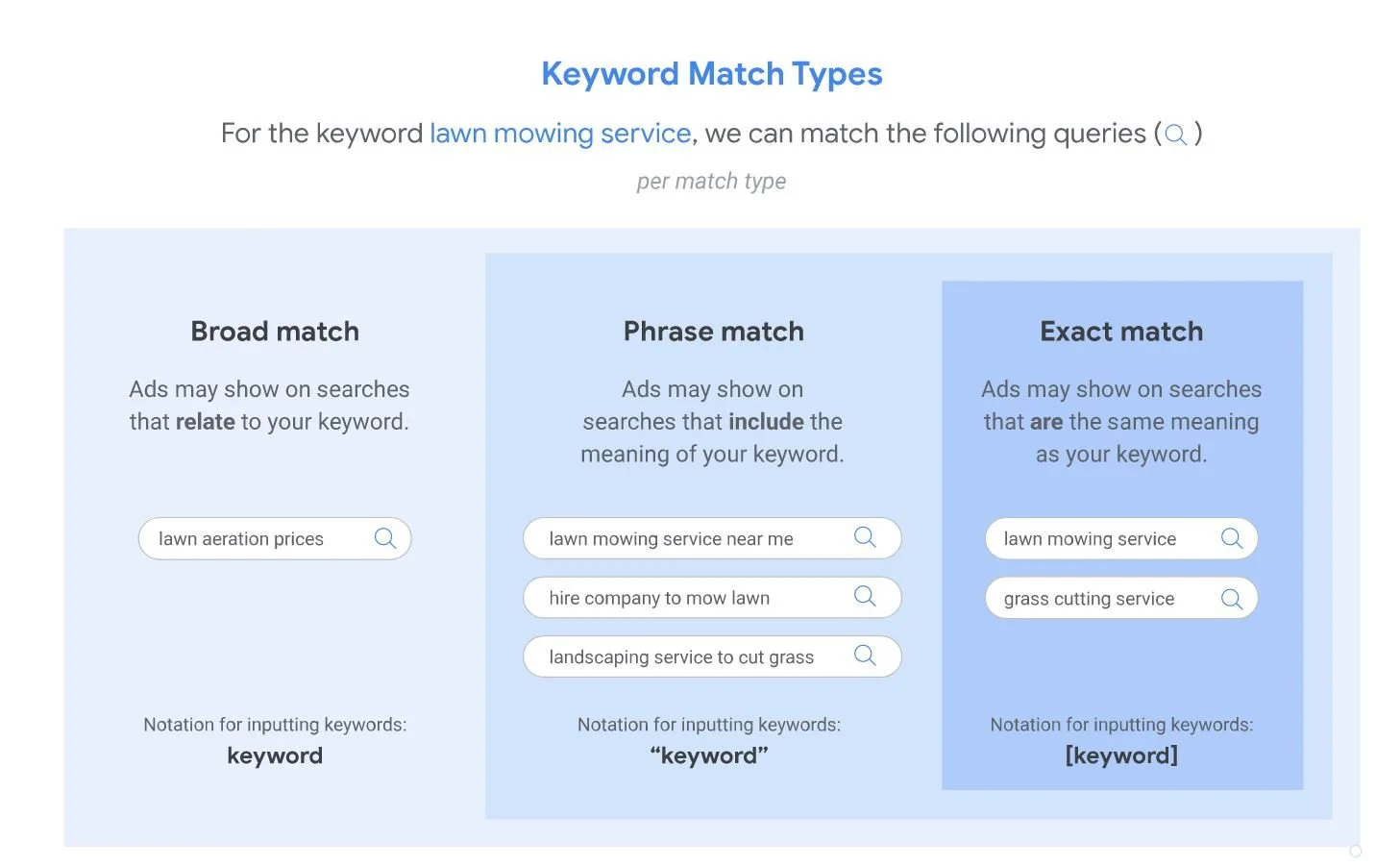 Simply put match settings are the precision with which you want the search to match your keywords. In google ads you can choose between broad match, phrase match and exact match. For our first campaigns we chose to use “phrase match” meaning that the search must include the meaning of the keyword.