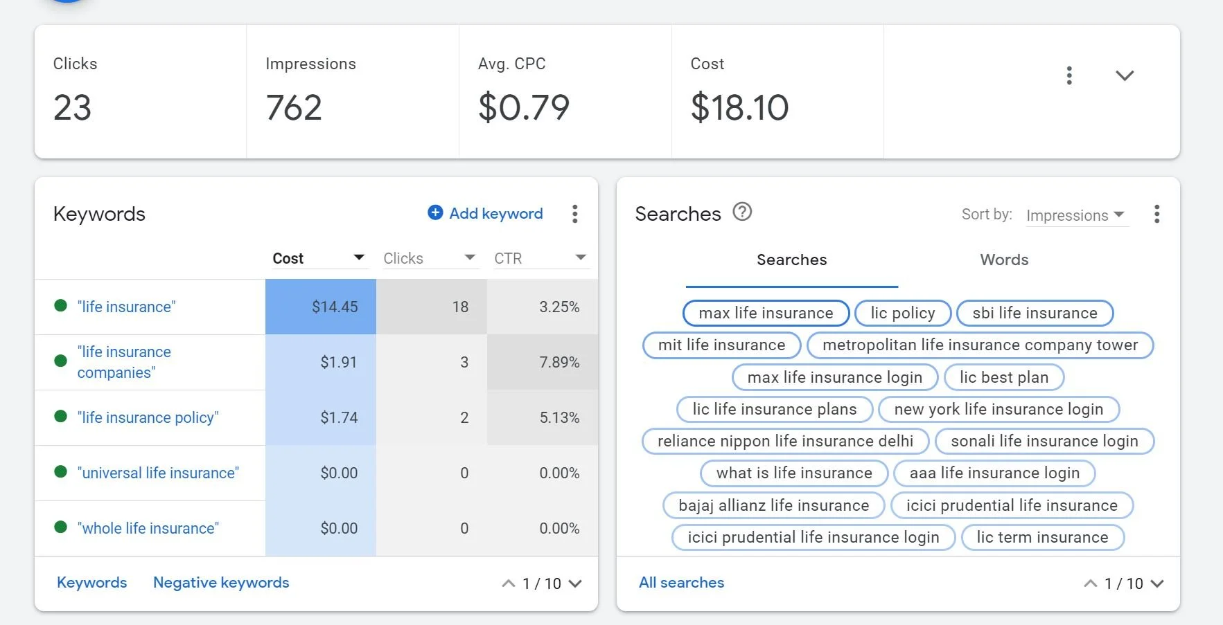 So scanning through the searches we hit (above image on the right) we can see that most of them are Indian insurance companies. Since our ads are targeting people living in the US we can assume these are Indian Americans researching insurance. Depending on our competitor strategy, we may decide to move all these into negative keywords. If we do indeed decide we don’t want to target that market we may also want to reassess our keywords and our budget.