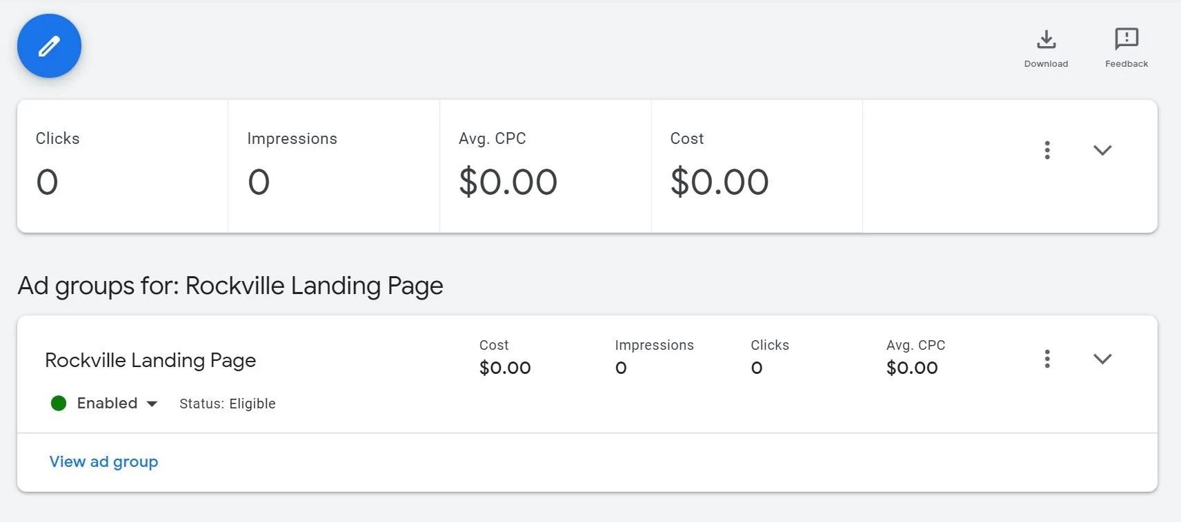 Our Rockville Landing Page got no impressions, meaning google wasn’t even showing it to people. This can occur for several reasons the most likely one in our case is a low volume of searches.