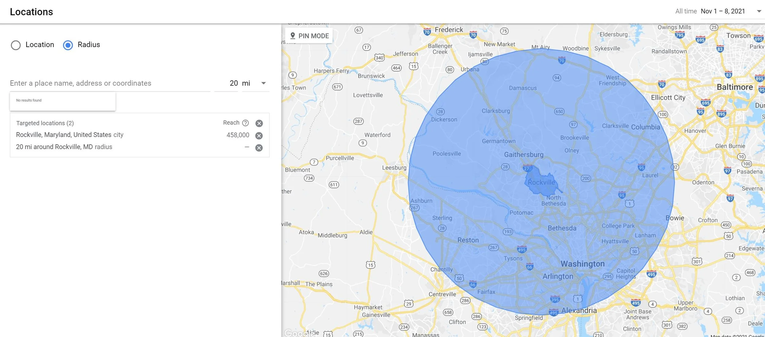 After taking a deeper look, the location selected Rockville was very specific (just the borders of Rockville). I have changed it from “Location” to “Radius” to try and broaden the audience and see if that gets us impressions.
