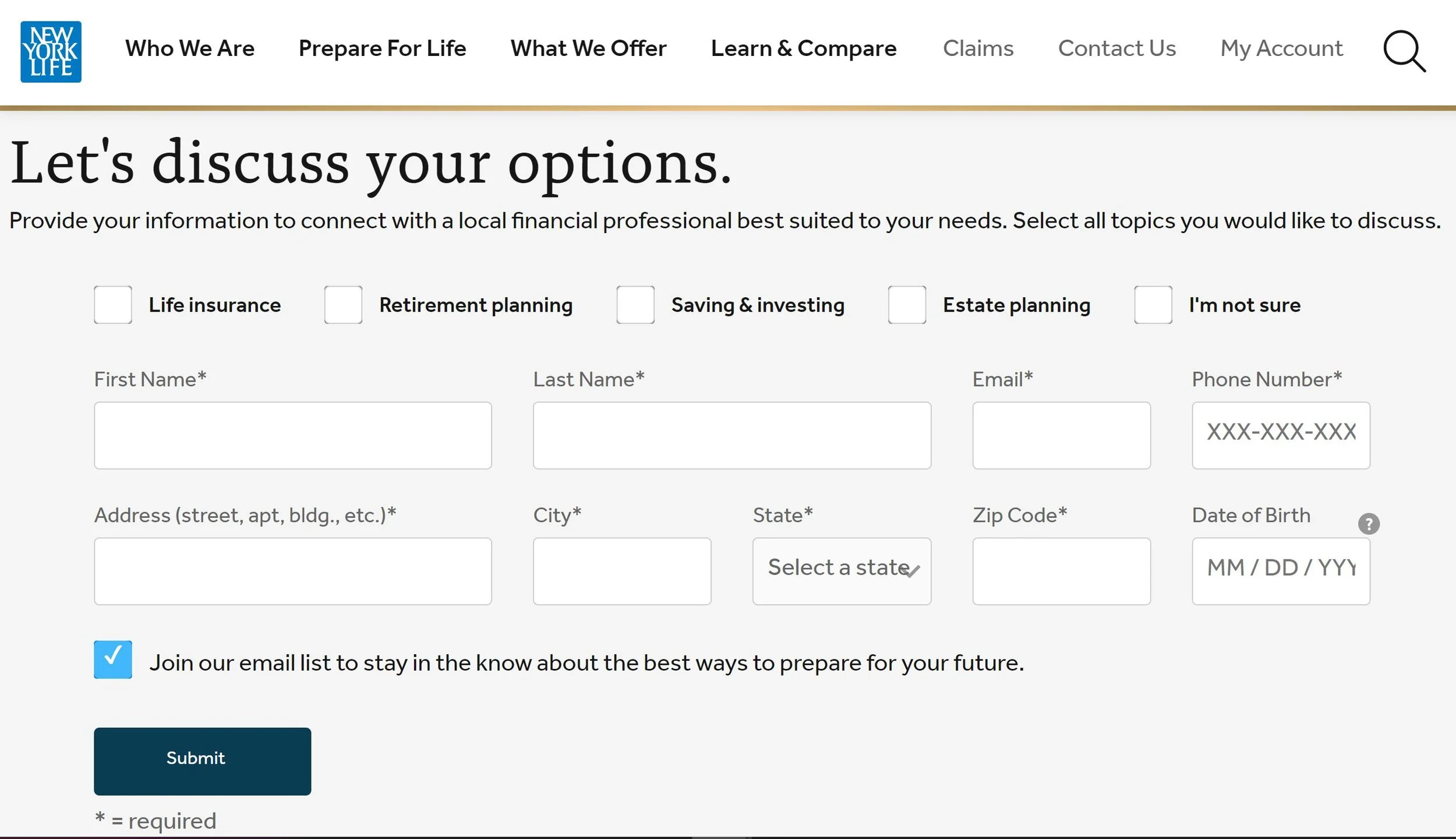 After showing interest NYL takes you to a product page with a very invasive contact form. No the best practice for building the top of a marketing funnel.