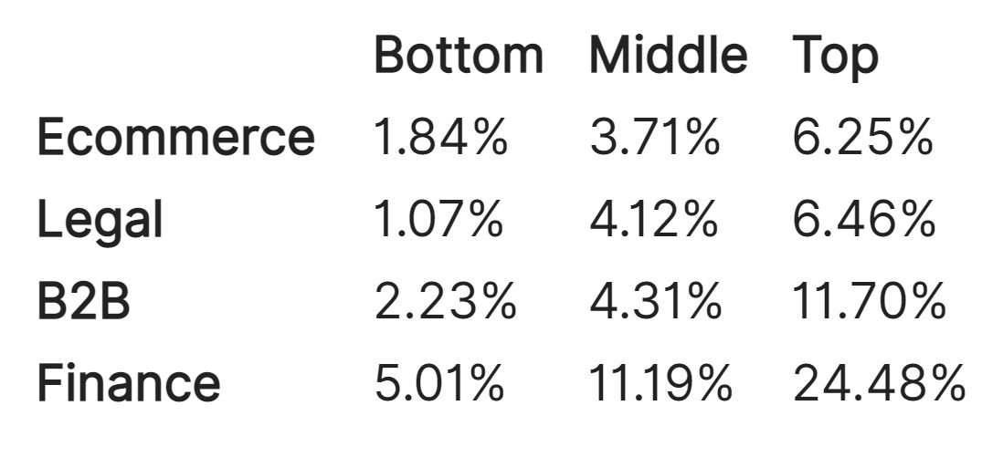 According to Wordstream the average conversion rate is a shallow 2.35% with the top 10% attaining a conversion rates of 11.45% or higher. These numbers can vary by industry. Adoric also puts average rates between 2-5% and gives us this industry analysis: